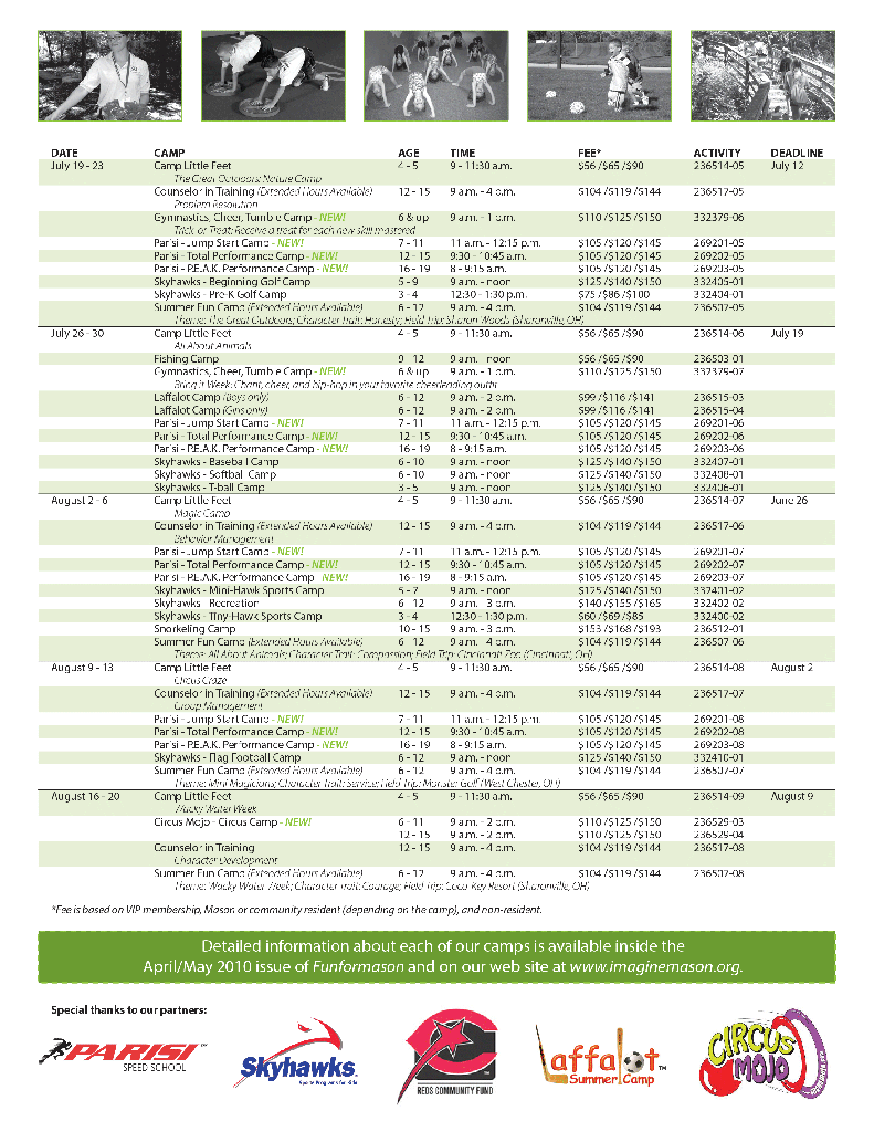 Brochure :: Camps Posted on 2013/04/02 Created using Adobe InDesign CS2. This brochure was created as a quick reference guild to city offered summer camps in a week-by-week format. The final piece was printed on 11×17 paper and folded. COVER (click images to enlarge) CAMP SUCCESS TIPS SAMPLE PAGE OF CAMP OFFERINGS Share this: Click to share on X (Opens in new window) X Click to share on Facebook (Opens in new window) Facebook Like Loading... Related